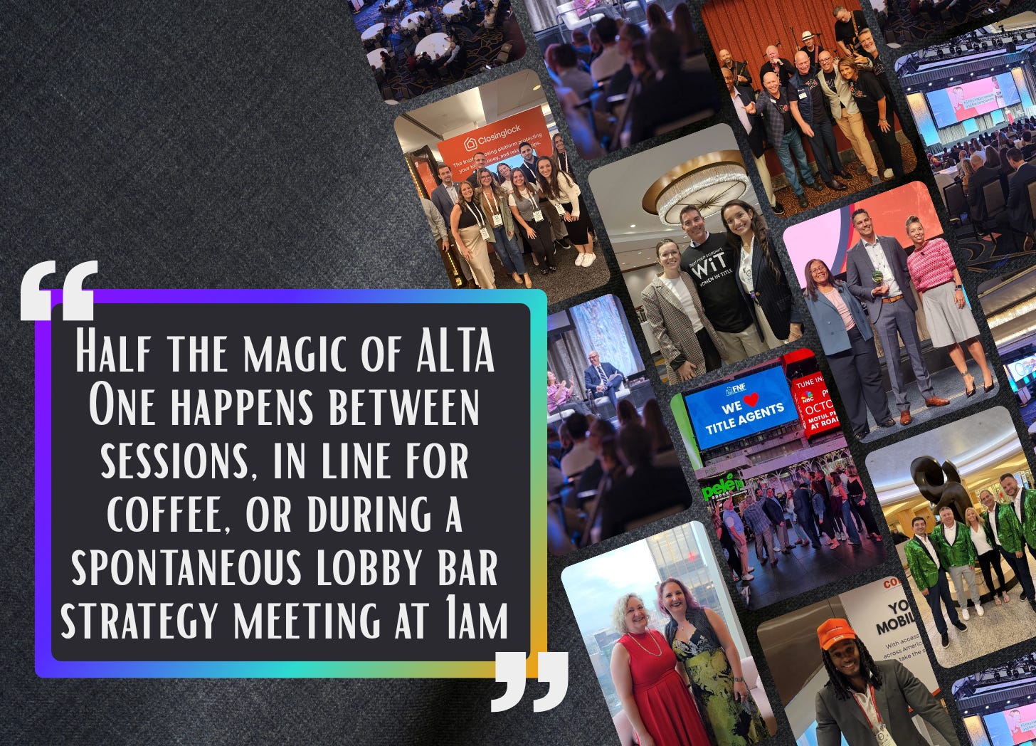 Sheâs right. ALTA One isnât just a conferenceâitâs the closest thing our industry has to a family reunion. For a few days every fall, the agents, underwriters, vendors, and consultants who keep real estate running descend on one city to swap ideas, war stories, and the occasional round at the lobby bar. Deals get born in the exhibit hall, collaborations hatch in the elevator line, and somewhere between compliance sessions and karaoke you remember why you love this business.