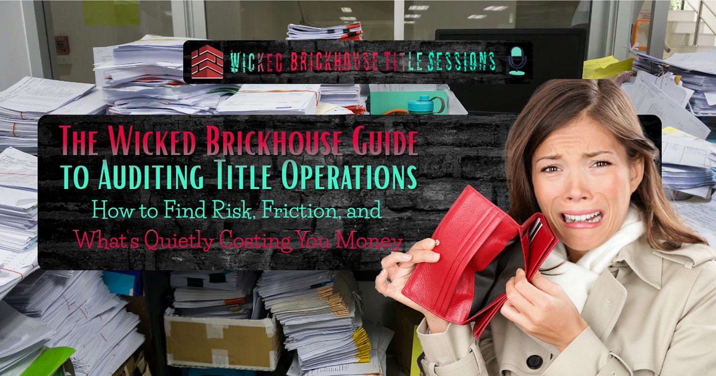 The Wicked Brickhouse Guide to Auditing Title Operations is a practical, no-nonsense audit designed to help title companies uncover hidden risk, operational friction, and profit leaks before they turn into claims, burnout, or financial surprises.